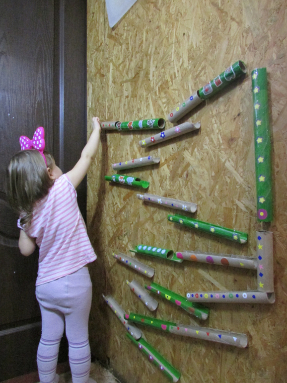 Самодельные весёлые горки для маленьких резиновых мячиков на дОООООлго занимают ребёнка. Если честно, то и взрослые дети, и мы с мужем частенько не прочь пару шариков там закинуть🤣