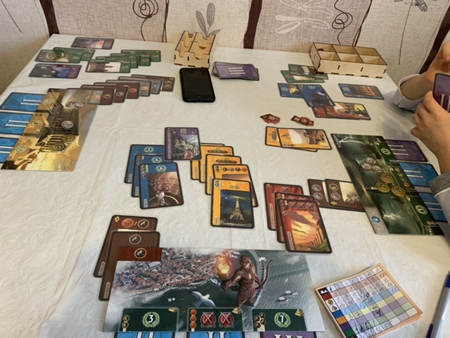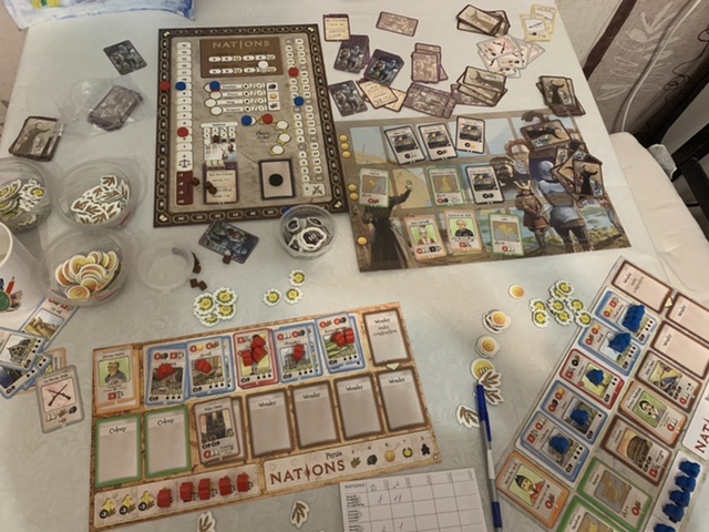 Еще одной нашей забытой игрой была Nations, игра-цивилизация. Правила мы благополучно забыли, поэтому пришлось пересмотреть летсплей и по время игры сверяться с буклетом с правилами. Nations называют приемницей Сквозь века, но короче. В последнюю я пока не играла, но в Nations мы уложились в 2 часа со всеми правилами.