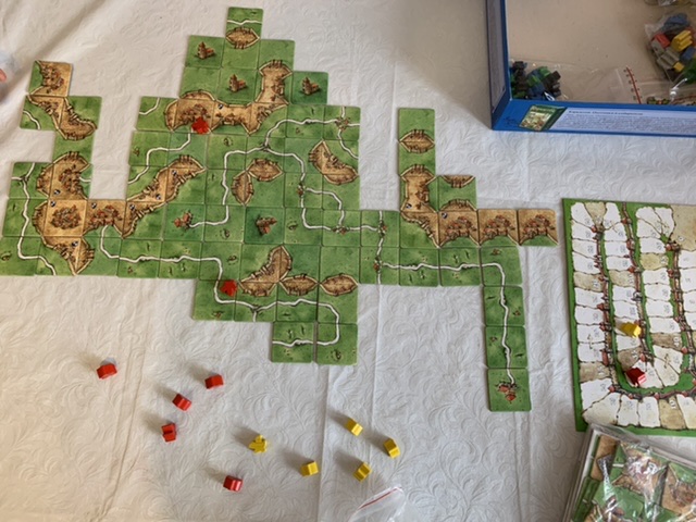 Нет, это с весны или лета (не помню точно) вариант игры соло мне покоя не давал. А накануне поста Морковкиной попалась мне на Авито в моем регионе практически новая коробочка за хорошую цену, решила взять. А уж после поста Морковкиной и волны Каркассона в сообществе жду не дождусь, когда она до меня доберется