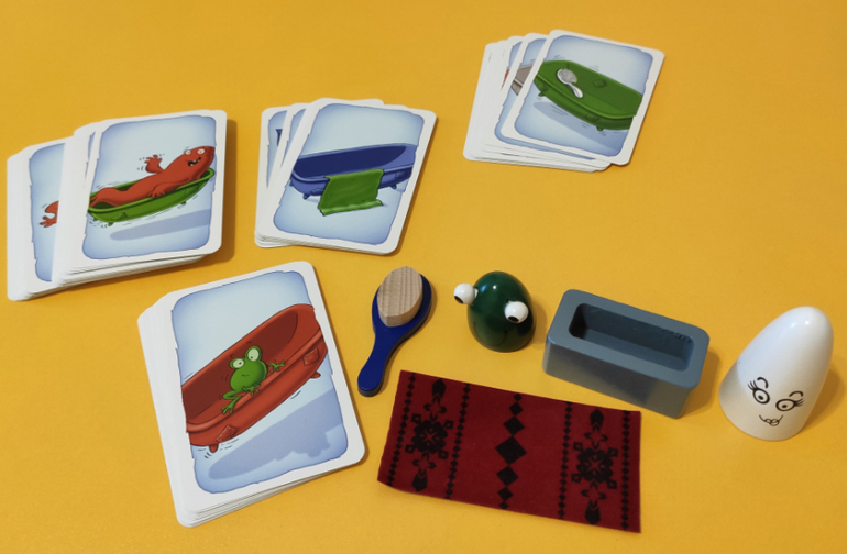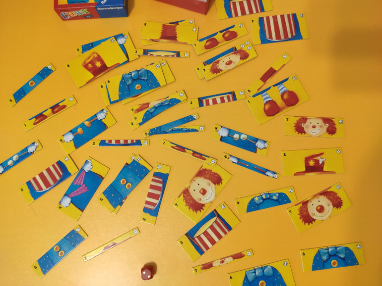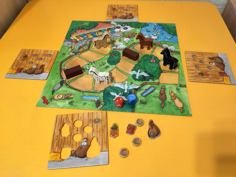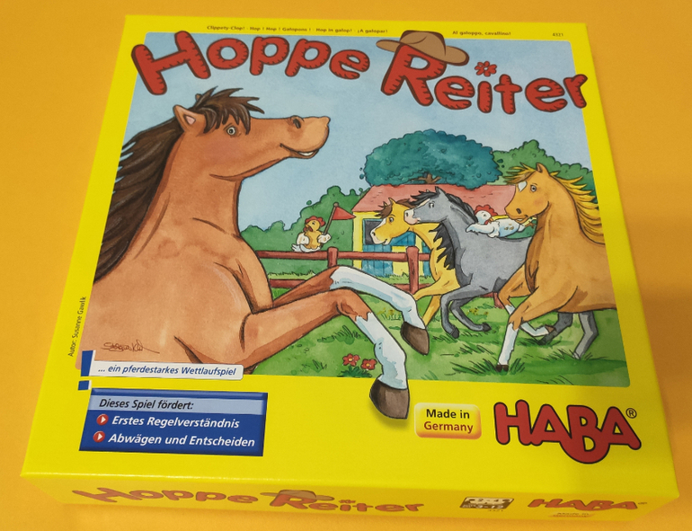Игра, насчет которой я больше всего сомневалась в этой закупке, но которая, сейчас вижу, отлично подойдет среднему сыну (3.7 года). Надо лошадкой добраться до стойла, параллельно собирая элементы в свой планшет - морковь, подкову и т.п.. Бросаешь сразу 2 кубика, и сам решаешь, что выгоднее сейчас, делать ход лошадью, или вложить еще 1 элемент в планшет. Лошадь не может дойти до финиша, пока не собран планшет.