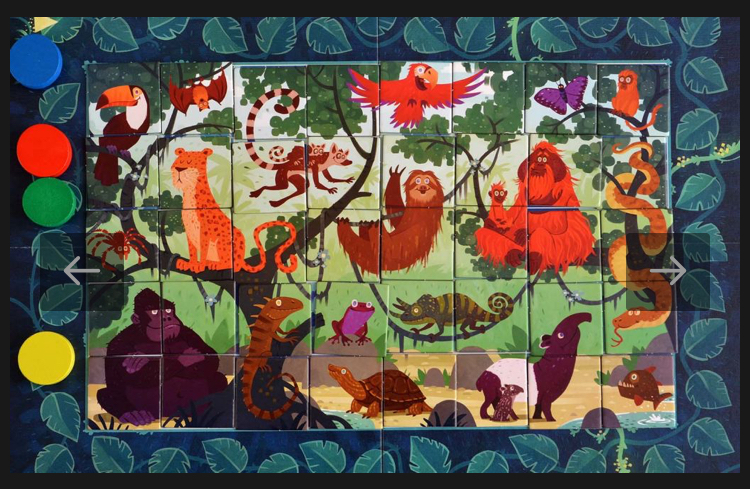 Во-первых, это игра на память - вам нужно запоминать, где какие кусочки картины лежат, чтобы быть эффективней противников. Во-вторых - есть две версии правил, посложней - с особыми карточками и попроще - с частично заполненным полем. Ну и в третьих - есть версия для совсем юных игроков - нужно собирать пейзаж, как пазл.