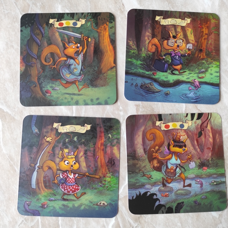 Вот раскладка начальная. Игрок выбирает себе чумобелку и располагает её на той дорожке, где будет искать орехи.