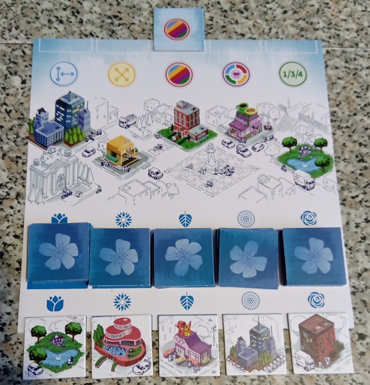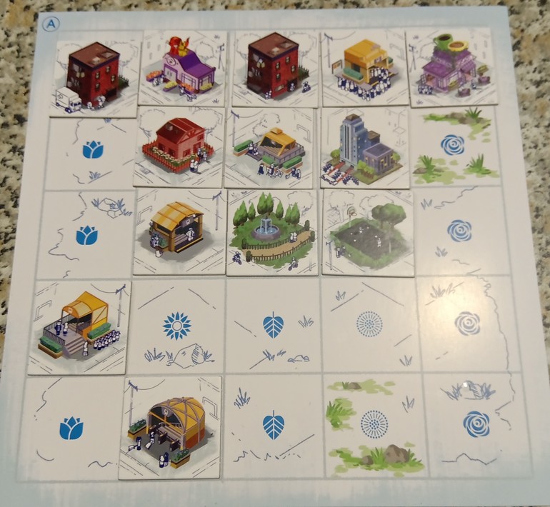 Каждый игрок получает пустое поле для застройки, два тайлика с домиками и цветочный жетон. Первый игрок получает золотую фишку.