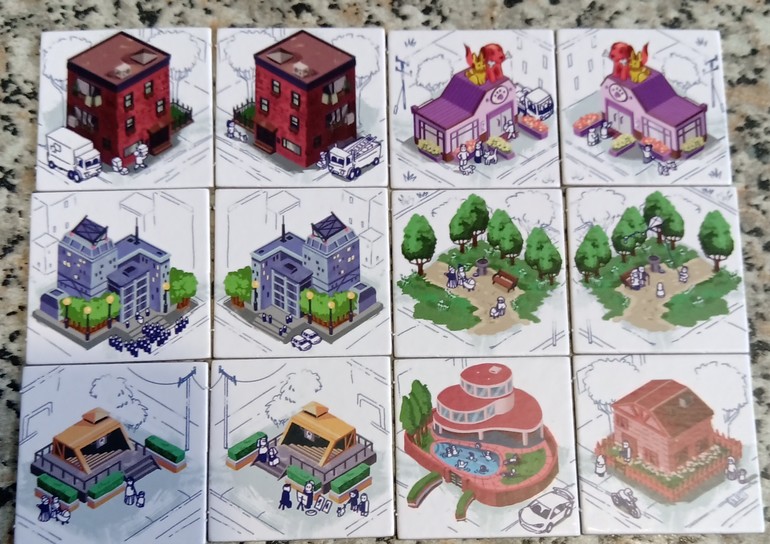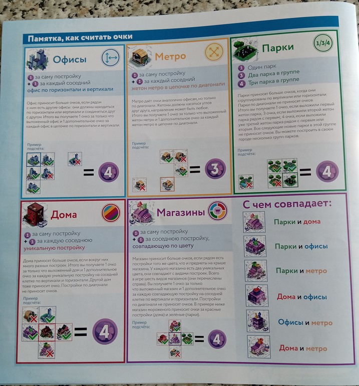 В игре 5 видов домиков. Офисы, магазины, дома, парки и метро. У каждого вида есть свои нюансы размещения, приносящие бонусные очки.