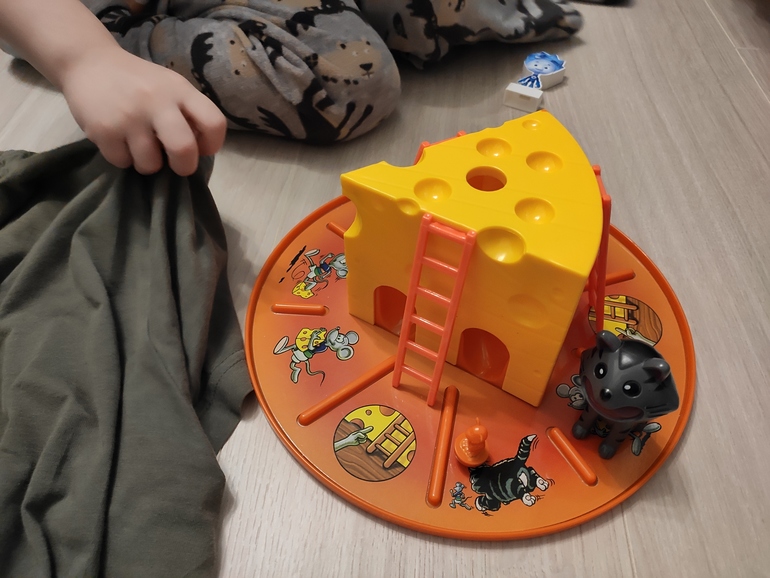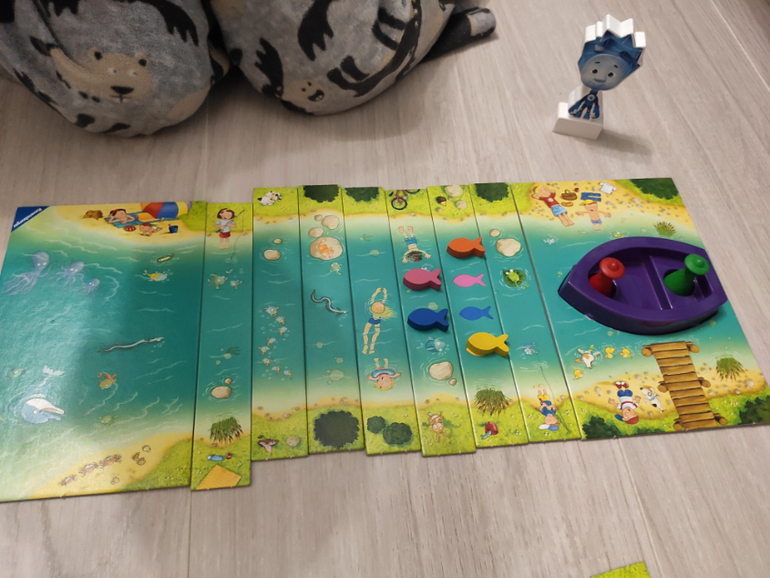 В "Быстрее, маленькие рыбки" и "Коварного лиса". Чтобы не греметь соседям по голове, под кубики подложили футболку. После чего я увидела подарок Ольги от сообщества - мягкую тарелочку для кубиков, и заказала нам такую же.