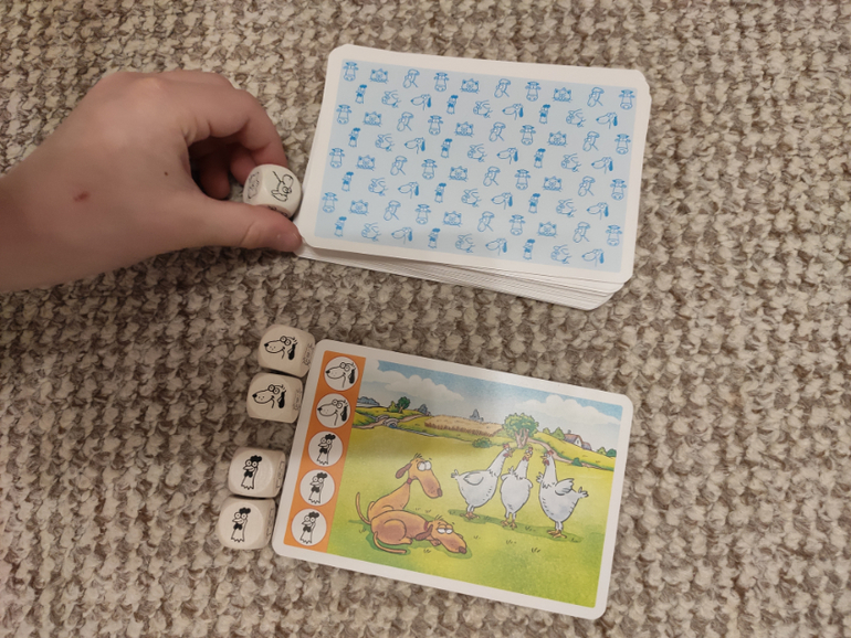 И в "Hoppe Reiter" играли, конечно. Нашли "дыру" в игре. Если чья-то лошадка стоит уже за шаг до стойла и планшет у хозяина собран, то сразу понятно, кто станет победителем. Поэтому мы на кубике лошадок закреили одну 3-ку наклейкой, и эта грань будет означать "пропуск хода". Тогда у соперника еще будет шанс догнать или даже обогать такую лошадку.