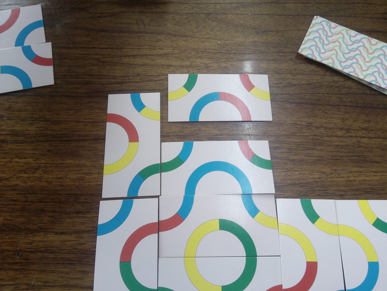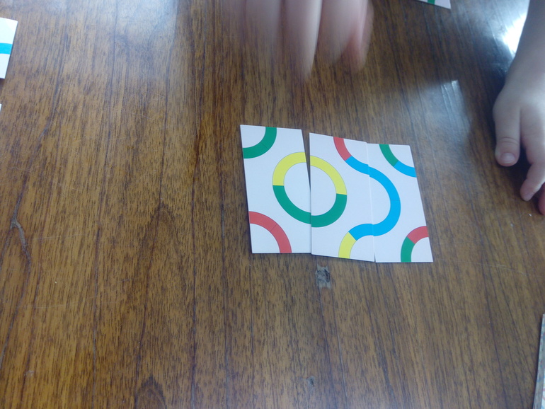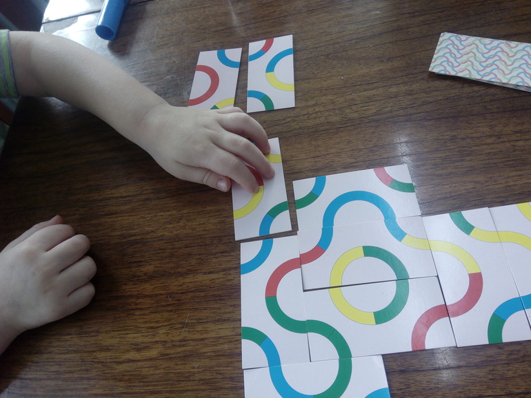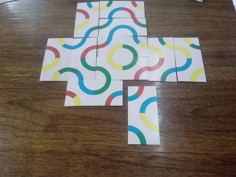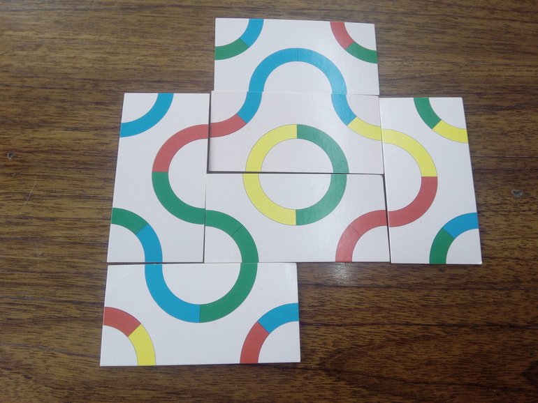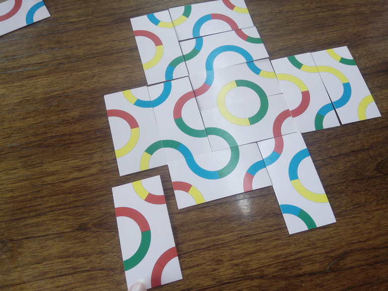 А вот ещё мой ход. Здесь мне удалось так присоединить карточку, что получилась длинная, непрерывная дорожка, в которой 7 раз меняются цвета. А это значит, что я могу сделать дополнительный ход!