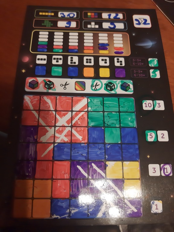 Третья игра появиласьпосле случайного захода в "Детский Мир". Это "Цветрис" по акции с 40% скидкой. Ролл-н-райт, зашедшей всей семье. Синтез любимого тетриса, "Картографов" и "Хитрого хода" - идеальное сочетание. Очень нравится закрашивать квадратики - такой медиативный процесс. 5 партий за 3 дня - и это только начало. Мой семейный рекорд пока - 92 очка.