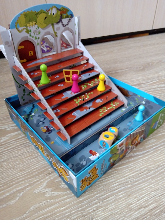 Задача игрока первым пройти в темницу дракона и освободить его. Количество шагов определяет кубик. Максимально за ход можно сделать три шага. Если выкидываешь 1 или 2, бросаешь второй кубик. Одна грань позволяет переставить дверь или щит, а вторая заставляет от лица колдунов скатить по лестнице камень. Игра не для обидчевых. Можно ненароком и себя столкнуть к подножию. Есть минусы у игры. Первый - у нас бывают скучные партии, когда один игрок за три хода проходит в темницу. Второй - игра неудобна в хранении, а каждый раз собирать и разбирать конструкцию боязно.
