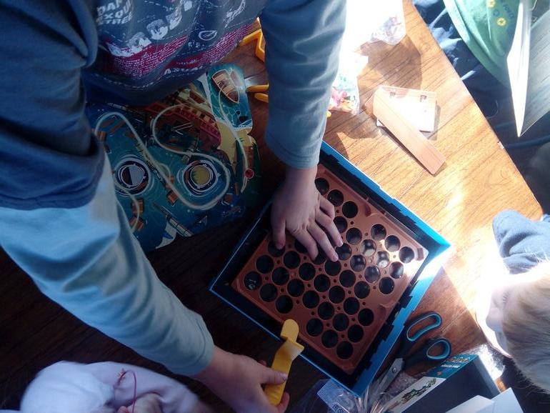Во-первых, это "Лаборатория" для сына. Игра настолько всем зашла, что нет ни одного фото - очень увлеченно партии проходят) Муж даже поставил себе версию на телефон. Теперь у него 2 самые любимые семейки: "Такеноко" и "Лаборатория". Сын сам вызывается собирать и разбирать ее, очень шарики пришлись по душе. Вообще, сбор сетов - одна из самых любимых механик в нашей семье, поэтому "Лаборатория" сразу была обречена на успех.