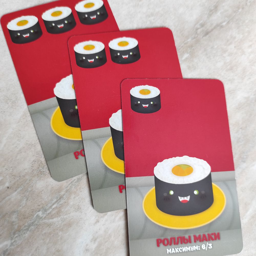 С Ролл маками посложнее. Надо посчитать значки роллов в верхней части карт у всех, у кого больше получает 6 очков, тот, кто на втором месте получает 3 очка. Если несколько игроков набрали одинаковое количество роллов, победные очки делятся пополам.