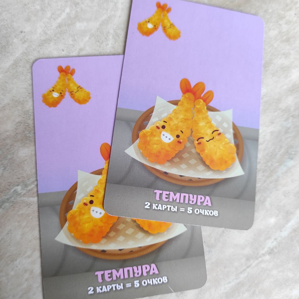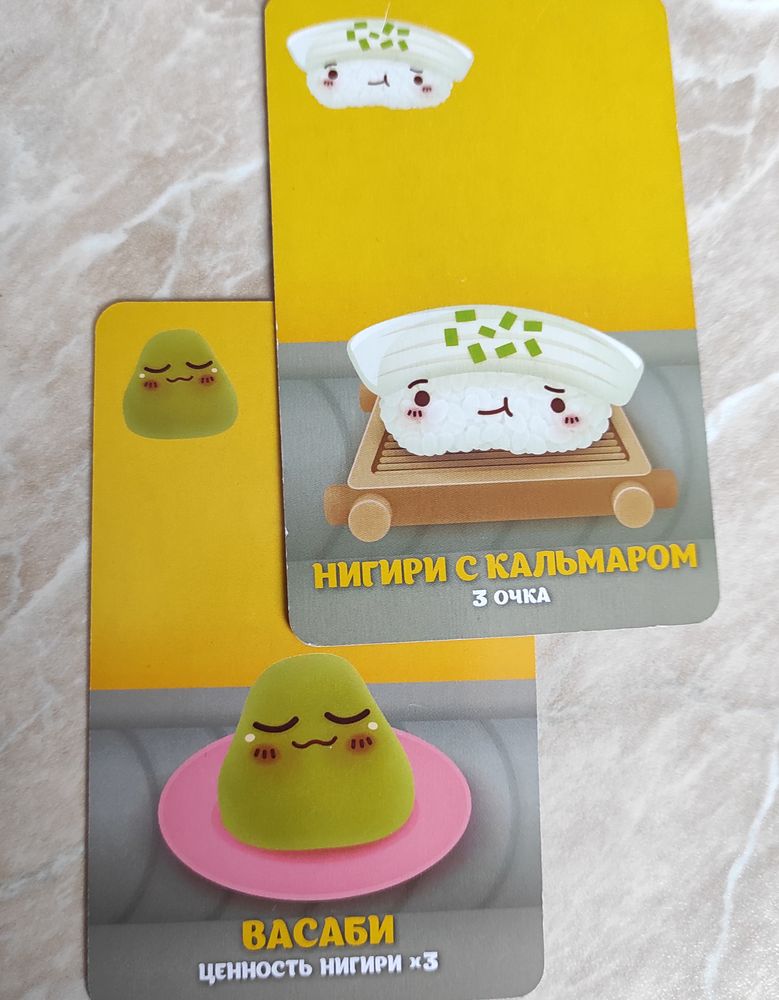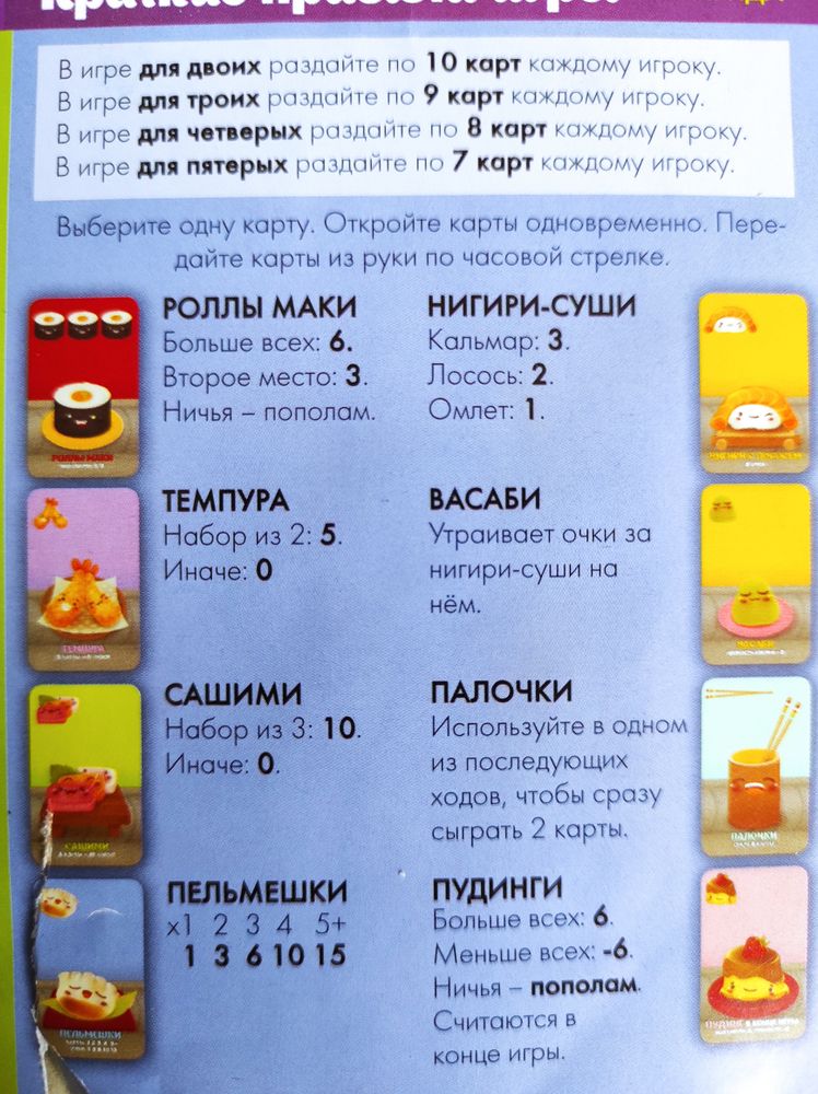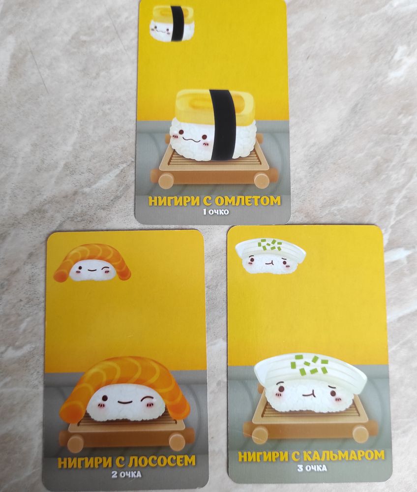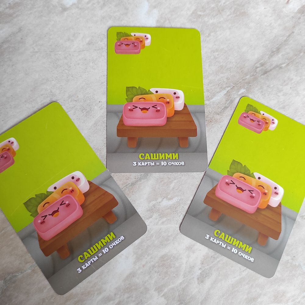 📜Играть можно от 2 до 5 игроков, и в зависимости от количества играющих карты на каждого раздаются от 10 до 7 штук. Всего в игре 3 раунда. Игра проходит быстро, единственное, надо в конце каждого раунда считать очки, подсчет похож на Ресторацию монстров, кстати Суши чуть на неё похожи как мне показалось.