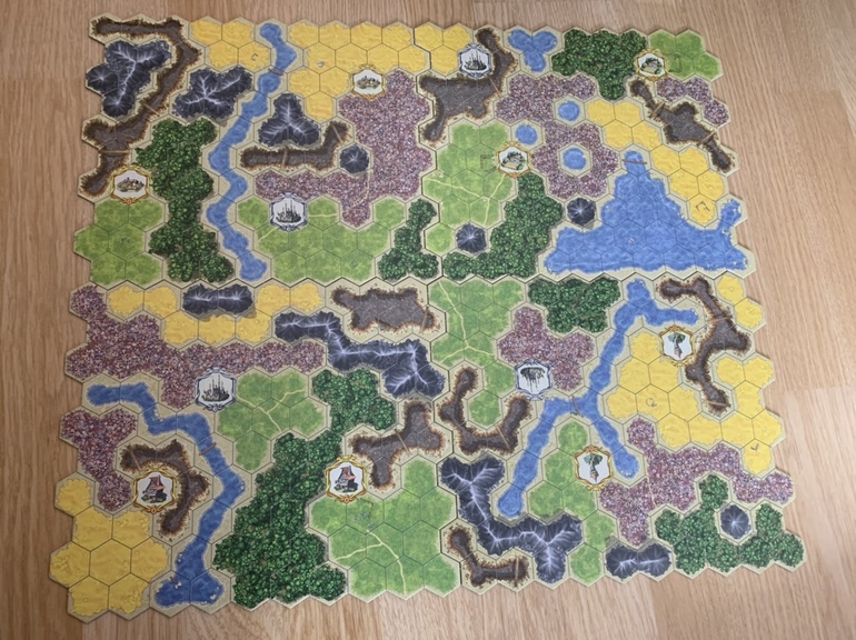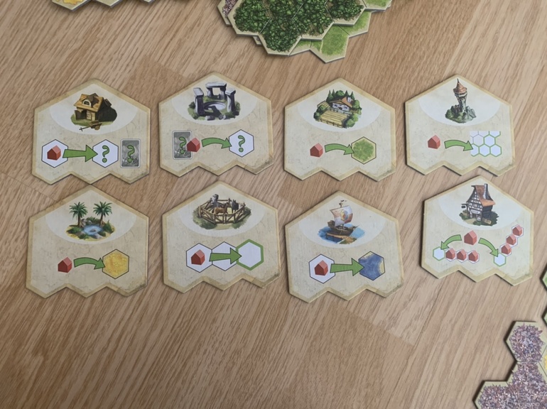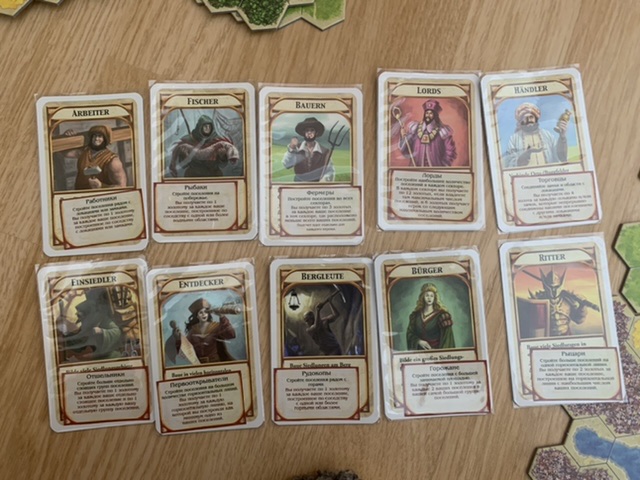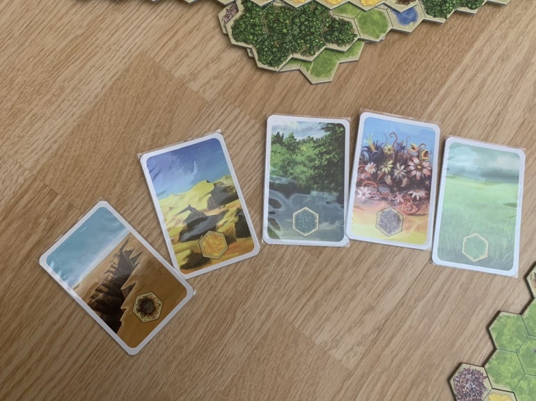 Каждый игрок получает деревянные домики выбранного цвета и взакрытую одну карту из колоды с типами местности.