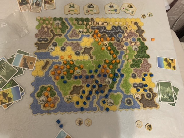Вдвоём тоже довольно интересно, все равно ты сильно ограничен приходом одной единственной карты и своими ранее выставленными домиками, так как обязан строить рядом, если есть такая возможность. Выставляя домик на поле надо хорошенько подумать чтобы не ограничить себе последующие ходы. Я вчера сама загнала себя в ловушку 😄 и проиграла