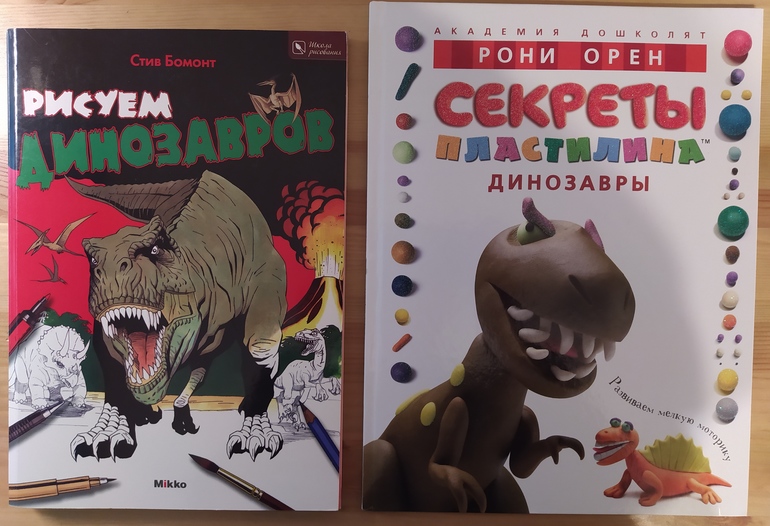 Было много тематических наборов для творчества и наборов юного палеонтолога (я не оценила). Вот такие книги ещё сохранились. Рисованием сын не проникся, а лепил с удовольствием