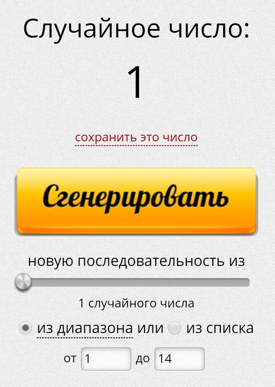 По традиции к одному из участников поедет небольшой приз. Призера мы выбираем всегда рандомно, сделаем также и в этот раз, запускаем генератор случайных чисел, который выберет один номер из 14-ти.