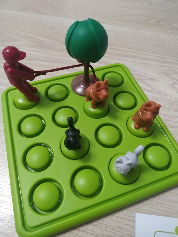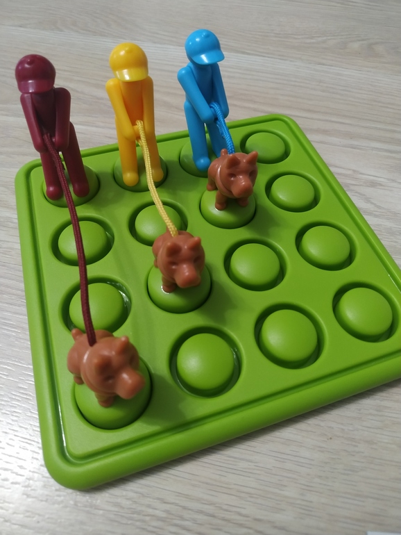 Одна собака одинокая, без хозяина, вторая на расстоянии одной клеточки от человека, третья на две, четвертая на три. Поводок не должен провисать, поводки не должны проходить над другой собакой, кошкой или человеком. Когда появляется дерево длинный поводок огибает его так (буква "Г" 3 на 2 клетки)