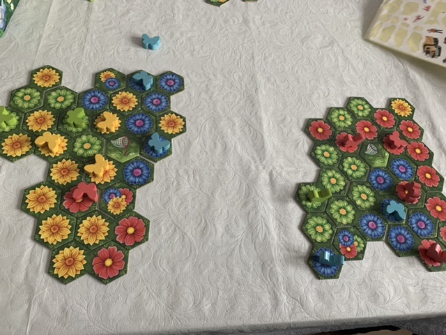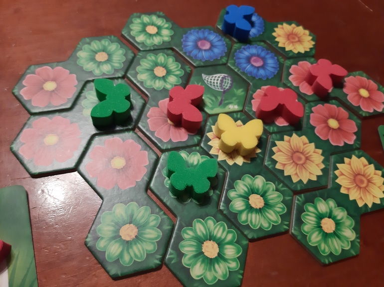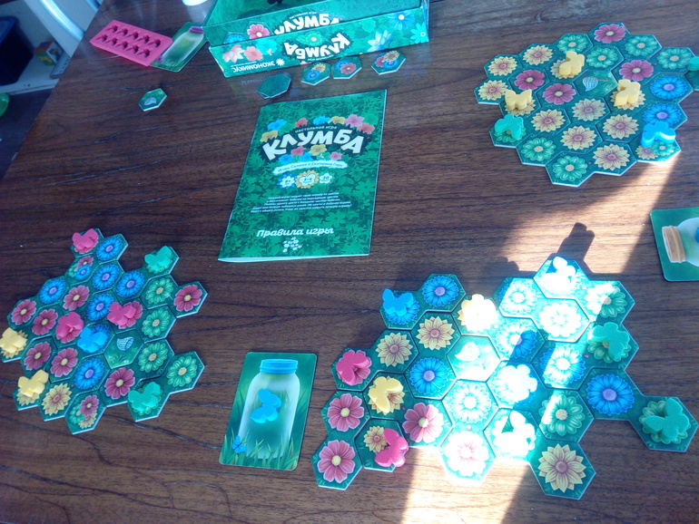 Клумба, самая подходящая игра для праздника! В ней даже тайлы в виде восьмёрки, цветы, бабочки. Сплошная красота! Первую партию втроём мы сыграли в воскресенье, сегодня обязательно повторим. Процесс занятный, чем-то напоминает Каркассон и Лоскутное королевство. Бабочки только в моей версии поролоновые, не то, конечно. Нет радости осязания, но дети то не знают, что может быть по другому, им нормально. Я тоже не отношусь к перфекционистам-будем играть дальше.