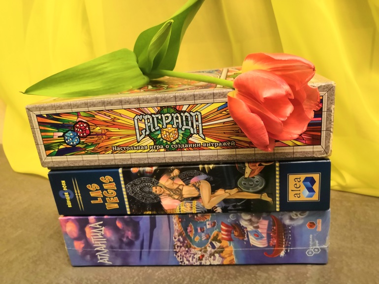 Все три игры для нас фактически новинки. С Атлантиды и Лас-Вегаса сняли сегодня пленку. В Саграду наконец-то полноценно сыграли. До этого было 1,5 партии. Первая комом, наделали много ошибок, ни разу не использовали инструменты, вообще не поняли зачем они. Потом была партия, которую пришлось прервать на 8 раунде и вот свершилось: сыграли, как надо и мои мальчики оценили игру.