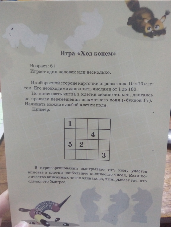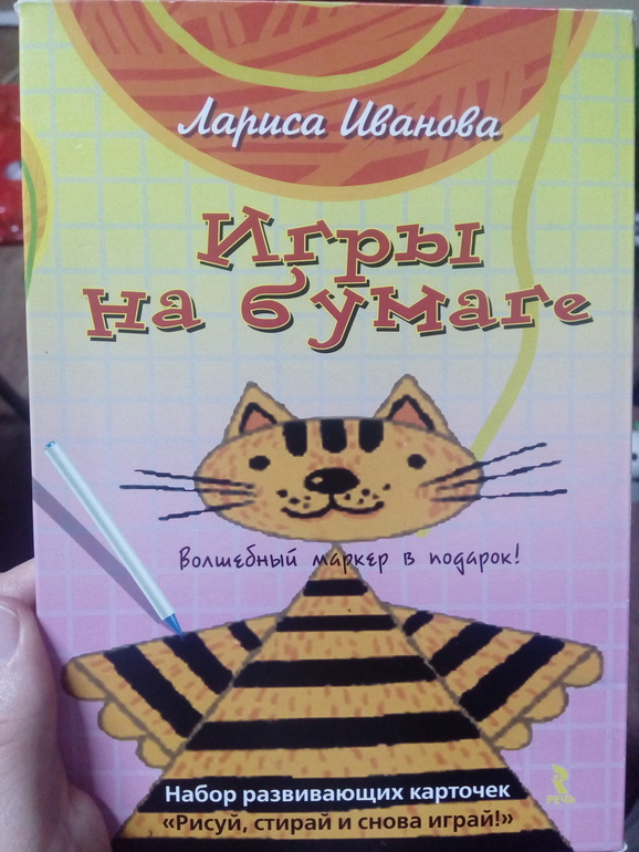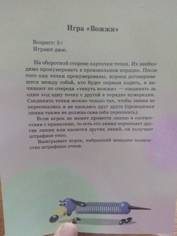 Этот кот на обложке совсем непривлекательный, а карточки внутри хорошие. Цвета приятные и рисунки тоже. В наборе 25 карточек, на каждой игра. Есть известные Балда, Виселица, Морской бой, Быки и коровы и другие. А есть такие, которые мне неизвестны. Понравились Вожжи