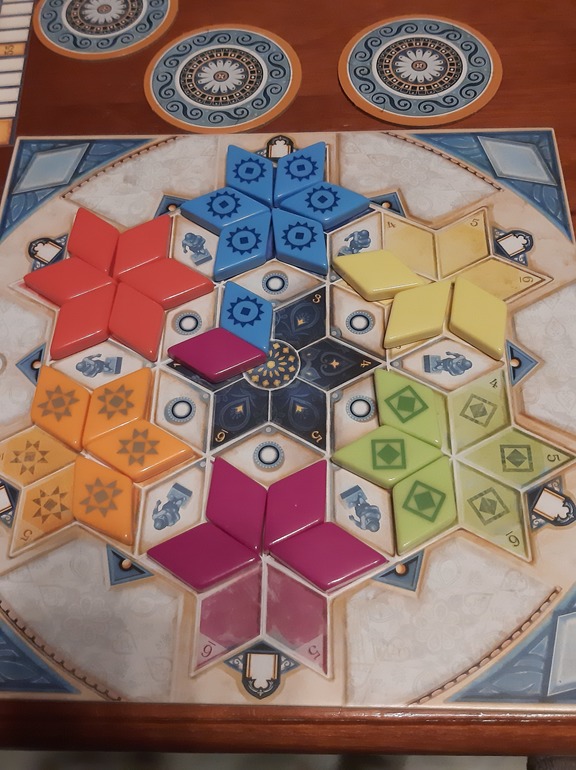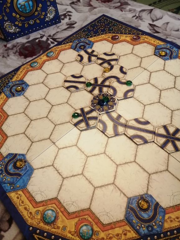 "Азул 3" вошел в мое сердце наравне с первым, хотя поначалу и были опасения. Сложнее, глубже, интереснее. Чем-то напомнил любимый "Хитрый ход": собираешь комбинации, которые дают тебе новые плитки, из которых снова собираешь комбинации и т.д. Не сразу все получалось - я проигрывала и мужу, и сыну. Но вчера я наконец-то выиграла мужа, собрав 2 звезды.