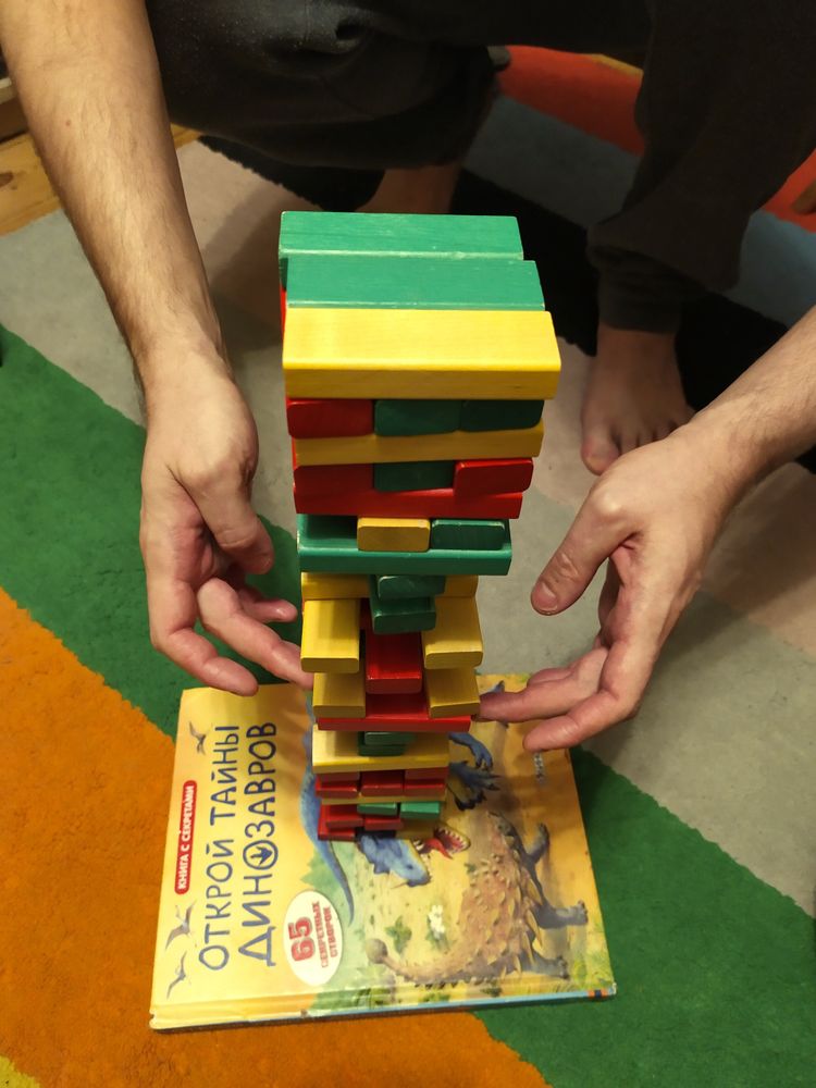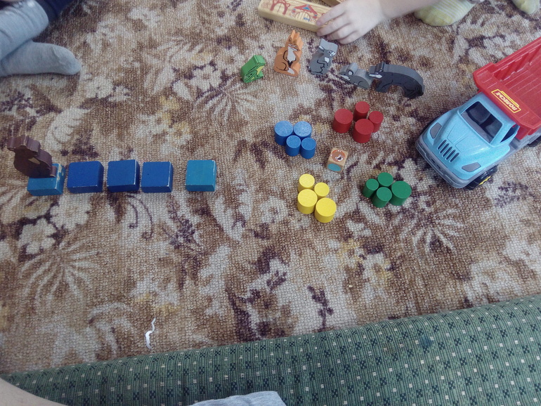 Зато в такие игры дети могут играть с продолжением. Я умиляюсь, как мой младший складывает эти брёвнышки, указывает их, потом снова раскладывается, потом что-то ещё с ними строит, медведя ругает. Получается вплетается сюжетно-ролевая игра в настольную и наоборот.