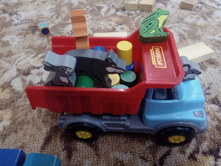 Звери после вероломного поступка медведя собрались и решили построить новые хоромы. Пригнали грузовик и стали складывать разноцветные брёвна в кузов (согласно правилам Каркуши), но каждый раз, когда на кубике выпадал мишка, косолапый приближался к месту погрузки. Если нам удавалось собрать все брёвнышки, звери прыгали в кузов, мышка за водителя и быстро-быстро уезжали...под стол! Там самое лучшее место укрыться от медведя и построить новый дом.