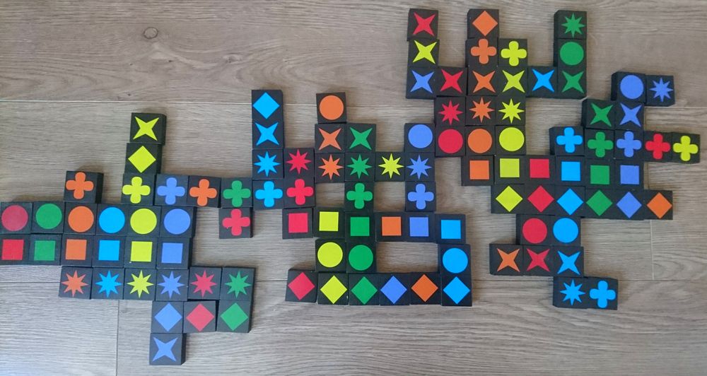 За последние две недели самая популярная игра у нас - чудом найденный Кверкл, теперь это семейный любимец наравне с Каркассоном, сыграть муж предлагает САМ)) Спасибо всем, кто упоминал Кверкл, благодаря этому я обратила внимание на эту чудо-игру, чему несказанно рада! Кверкл гениален в своей простоте, и хочется играть снова и снова. Мы играем в открытую,и сын сам сообразил, что при наличии четырёх элементов ряда ему невыгодно выставлять пятый, если у кого-то есть шестой))