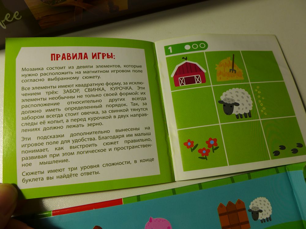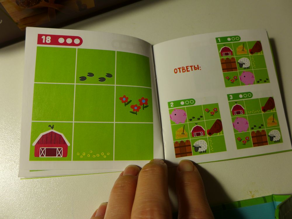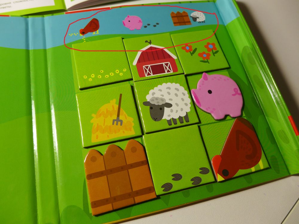 Вот на первом задании, слева от овечки должен стоять забор, она за ним прячется. За свинкой должны идти следы, значит свинку нужно поставить под овечкой, а перед курочкой должно лежать зерно, значит корочку располагаем рядом с сеном.