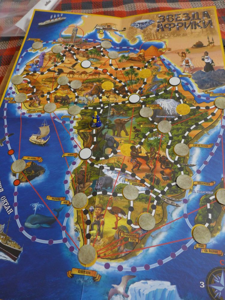 Звезда Африки (отсутствует на общем фото) - у меня сразу вопрос, если один игрок нашёл алмаз и намыливает лыжи в город, а второй своим ходом удачно встал на ту же фишку - что делать в таком случае? Одновременно бежать в любой город, и тут уже кому улыбнётся удача, тот и победил? Впервые кубик был на моей стороне, пока дочь шла по одному шагу в сторону победы, я семимильными шагами добежала до аэропорта, пролетела и приземлилась с алмазом в кармане.