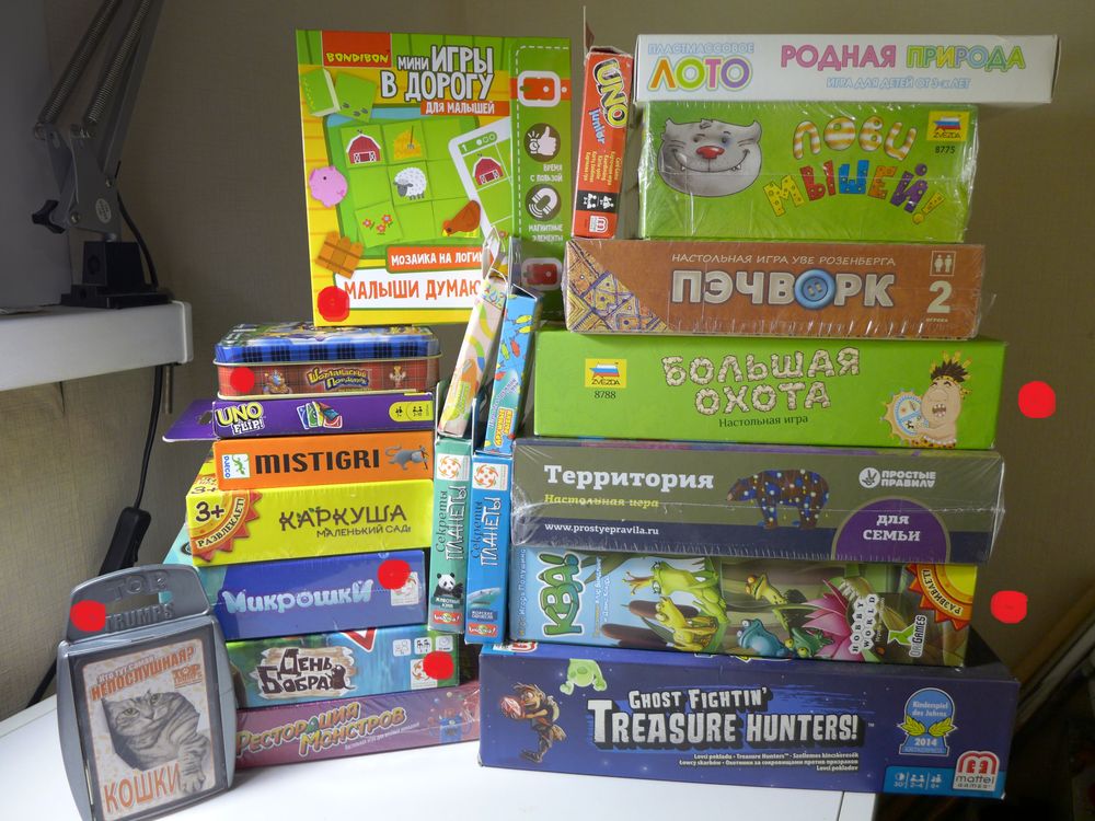 Игровые дневникиБудет много текста, а вот фото не со всех партий. Меня тут не было 4 недели, пятую я посвятила перечитыванию постов, которые пропустила. Сказать, что за это время мы много играли, я не могу, именно партий было очень мало. Но я (вопреки здравому смыслу, отсутствию свободного места (хотя тут просто нужно сделать хорошую ревизию в одежде и ненужных мне вещах) и пока ещё намёкам мужа) заказала и купила несколько новых коробочек, достала что-то из старых запасов (не прошло и пары лет)), взяла с полок просто новые для нас б/у игры - мы много чего изучили! Сейчас общее фото коробок (делала уже вечером), которые мы открывали, делали пробные партии новинок и просто наслаждались старинками. Правда я забыла доложить малышковские, которые сын выбирал. Новинки пометила красным кружком.