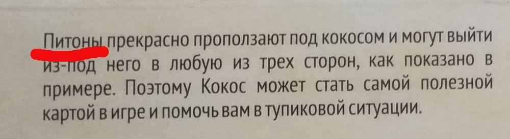 Последннее - про КОКОС. Думали мы думали и решили для себя по крайней мере что через КОКОС могут проползать по два питона. Опять же в правилах стои множественное число: