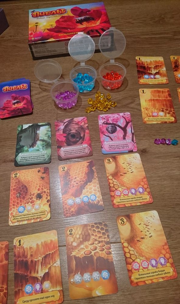 Самая последняя новинка - Пчелы. Тайное королевство, я не удержалась при виде скидки и вчера её забрала, уже успели сыграть 3 партии с сыном. Игра не так уж проста, особенно с картами ульев, позволяющими разнообразить получение ПО. Причем мне самой интересно играть с ульями, игра превзошла мои ожидания! В двух партиях с ульями я обошла сына,будем тренироваться учитывать все нюансы. Надеюсь, что на Пчелах сын набьет руку, и потом ему будет проще играть в Роскошь, идущую с Али))