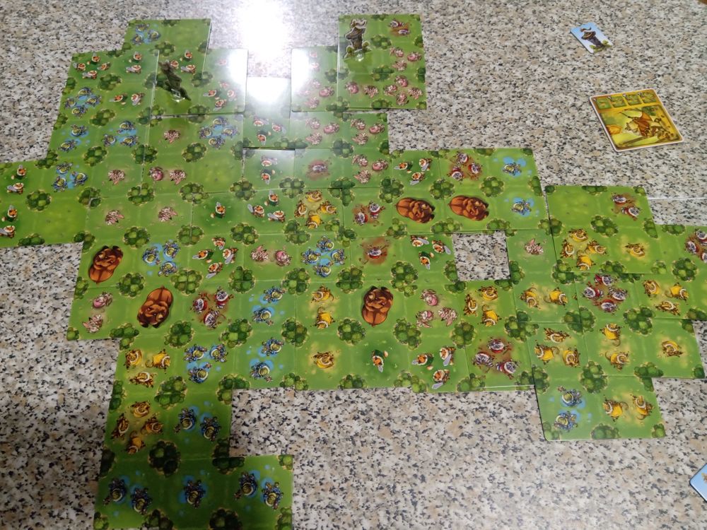 Нужно первым обезвредить центральную бомбу, выкинув три разных цвета на кубике. Продвигается каждый со своего стартового тайла на один шаг за ход открывая попавшиеся тайлики, которые оказываются либо помощниками, либо препятствиями на пути к цели. Игра веселая, динамичная. И все бы хорошо, если бы не утомительная раскладка поля из тонких тайлов. Бесит! Та же история у нас с игрой В поисках новогодних подарков: эдакий тематичный аналог Эй, это моя рыба. Но мне и механика не очень нравится, хорошо что оригинал не купила.