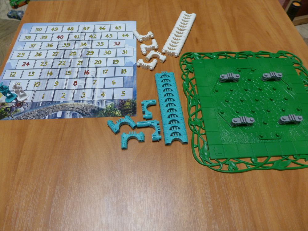 Кто лучше построит - тот и станет зваться великим, ну или что-то вроде того. Так же в составе счётчик очков (безумно тонкий), правила на 4 странички, сценарии на 2х игроков и 3-4. У каждого архитектора (их 4 цвета, не привычные светофорные, а нежные - лавандовый, мятный, нейтральные серый и белый) свой цвет деталей (мостов, окон, портала, балкона).