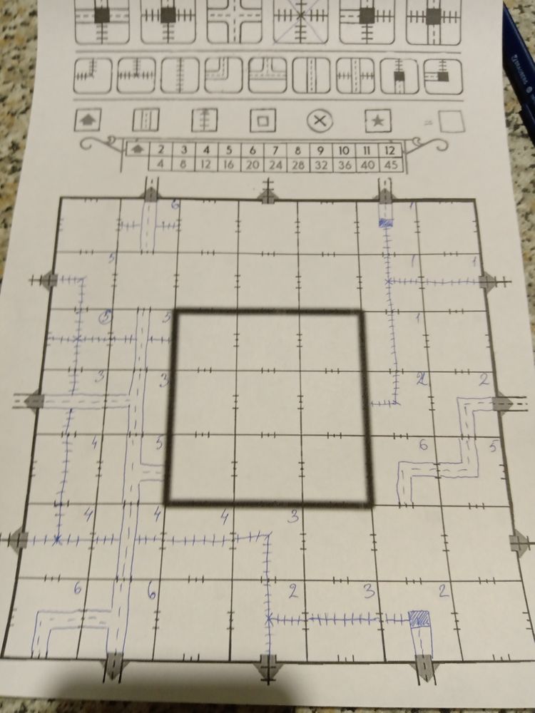 Самый длинный дорожный маршрут пометила синими кружочками, считается как бы непрерывная кривая, без ответвлений, если кругом соединено, то по два раза одна клетка не считается.