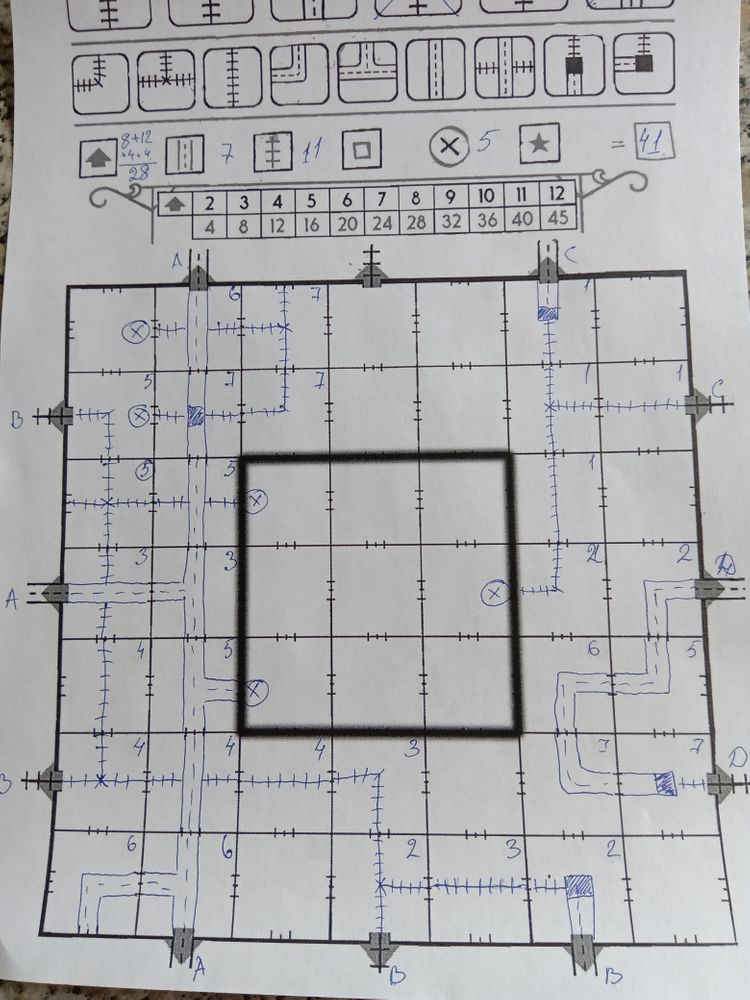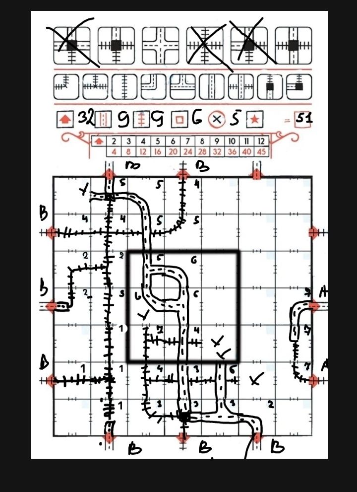 Станции помеченные А соединены между собой. За три соединенные станции 8 очков. Станции помеченные Б между собой соединены, за них 16 очков. Станции А и Б между собой не соединены. От любой станции А к Б не проехать. Если бы на клетке крайняя левая, вторая снизу было бы пересечение дороги и жд, тогда они бы все соединились, но там нет пересечения. Также как станции В. За станции В тоже 8 очков. За станции 32.
