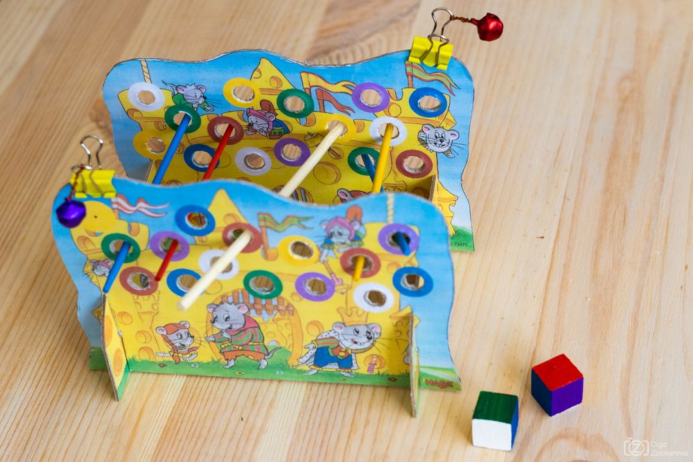 Ещё одна игра от Haba: Тихо, как мышка. Это игра на ловкость рук и точность движения. Нужно просунуть палочку в отверстия выпавших на кубиках цветов и не задеть при этом сам "Мышиный замок". Потому что иначе сработает сигнализация: звоночки на обеих сторонах конструкции.