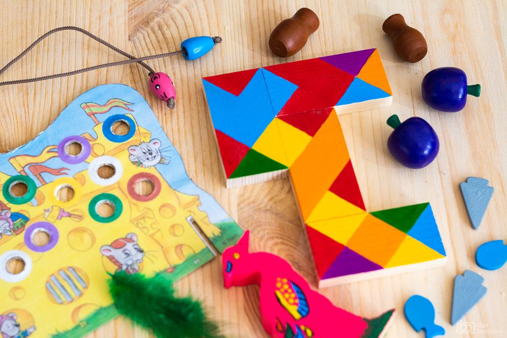 36 деревянных пластин с разноцветными элементами. Каждая пластина имеет свой основной цвет (он всегда в центре пластины), а количество цветов, расположенных вокруг центрального, может быть разным. Таким образом, определяется название каждой пластины. Например, К1 - красная единица, пластина целиком красного цвета, Г5 - голубая пятерка, центральный цвет голубой и на пластине кроме этого есть еще 4 цвета.