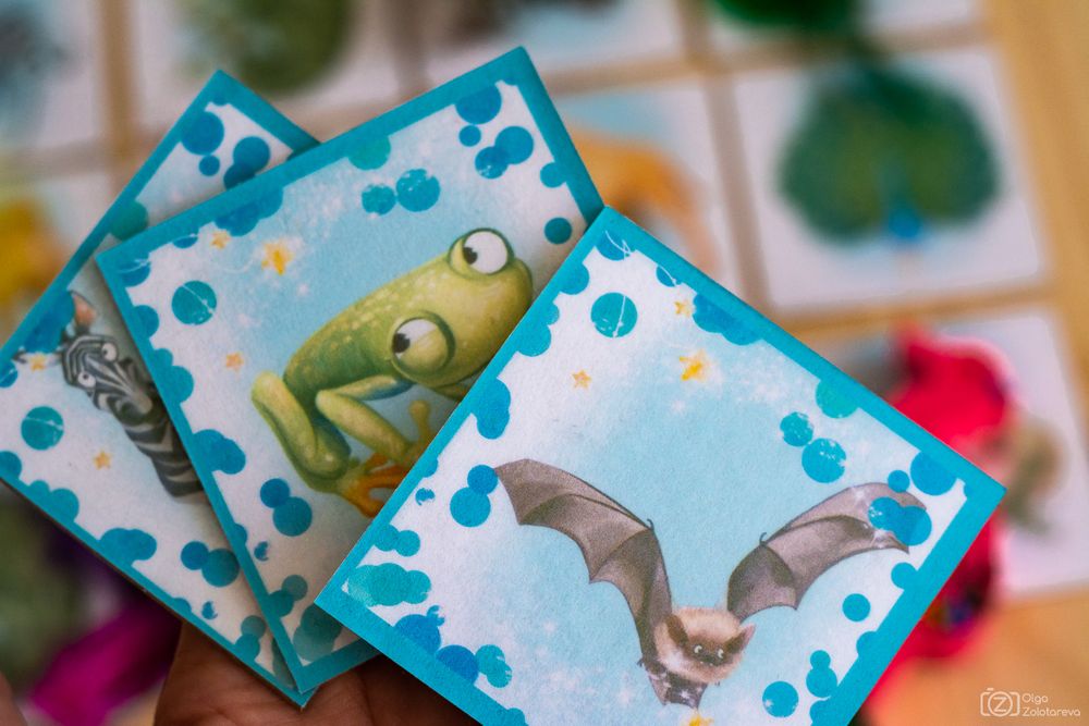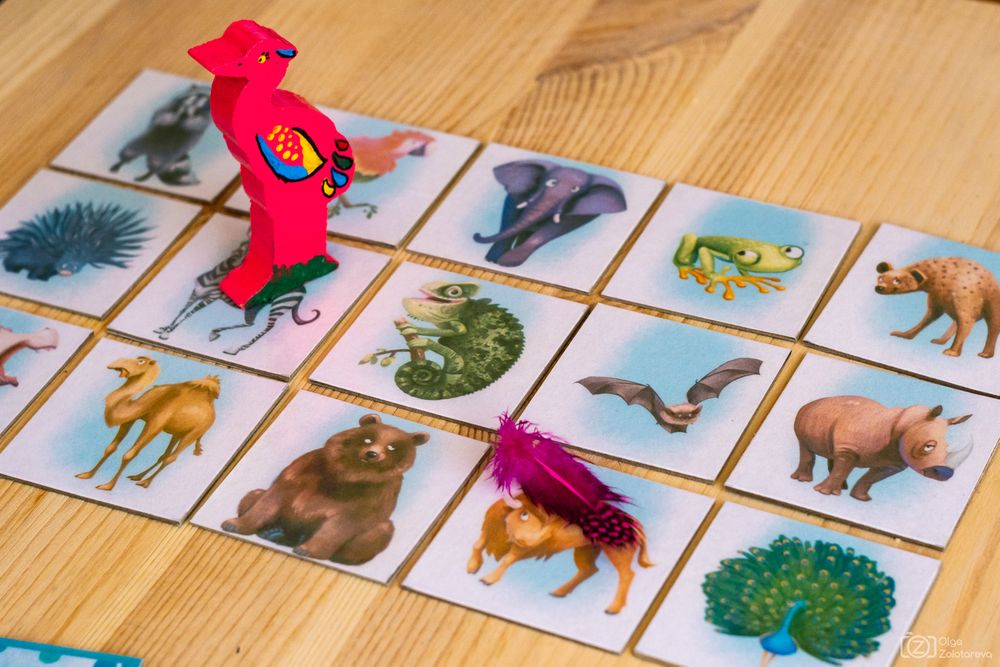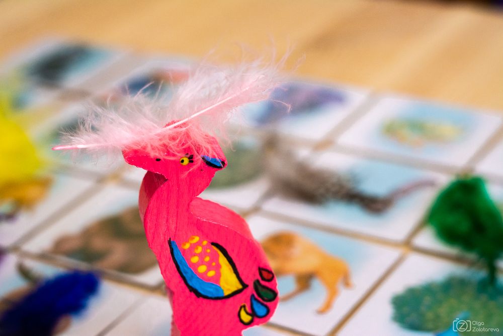 На самом деле, чтобы поиграть в эту игру, нужны перья и парные карточки с животными, любые. Птица играет декоративную роль и заменяется при желании чем угодно, а вместо переворота карты на "зачарованную" сторону можно использовать какие-нибудь метки типа камушков блестящих. Но я зачем-то заморочилась)) Животных я взяла из пнп другой игры "Живые истории", кажется.