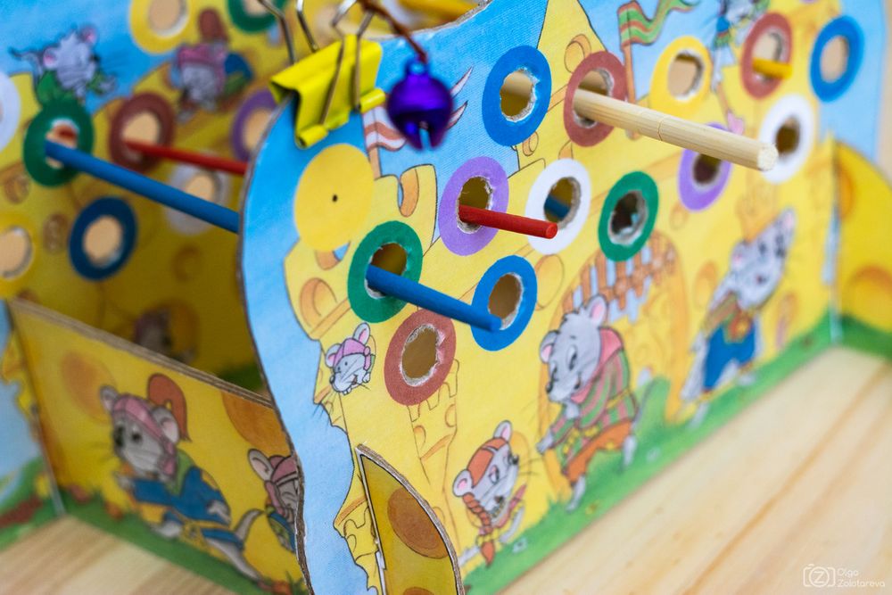 Картон для замка - переплетный, дырявили его мы долго и мучительно. Всё остальное делается легко, но усталость от ручного выкручивания дыр пррбойником я буду помнить долго)) Палочки хотели взять для суши, но тут на глаза попалась игра Микадо. Заодно и саму игру Коробочка Микадо приютила. Теперь у нас игра на ловкость 2-в-1.