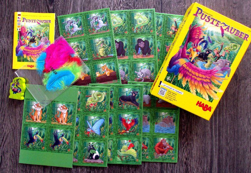 Следующая игра, которую я сделала уже давно, и даже показывала, но вскользь - Pustezauber Haba, точнее, её редизайн-версия в моём исполнении))) Ибо сканов не было, и пришлось заморочиться. Игра состоит из цветных перышек, деревянной фигурки чудо-птицы и 20 пар двусторонних карт животных, где одна сторона простая, а вторая - "зачарованная" (в окружении звездочек и пыльцы как будто). В оригинале так.