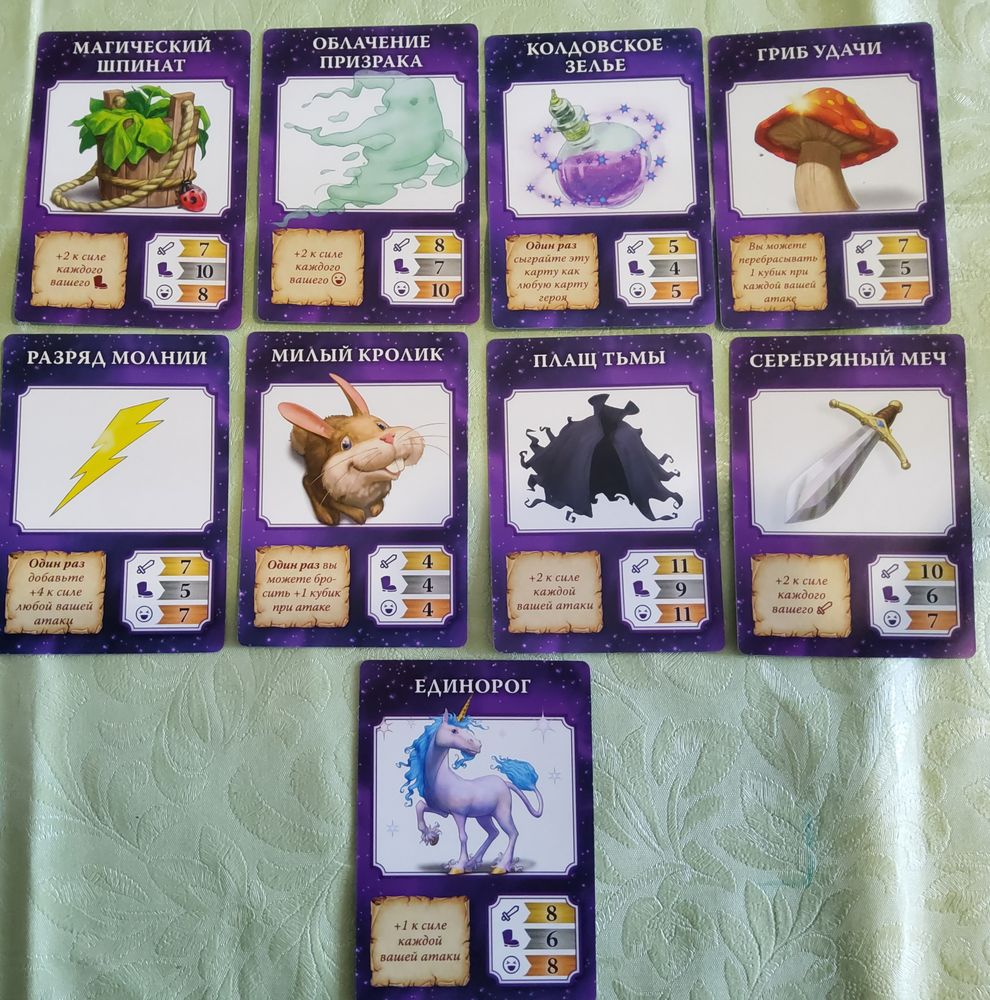 Их мы и будем побеждать. Победить можно тремя способами: ударом меча, выложив карты с числами по порядку; затоптав картами с одинаковым номером, и оглушив криком с помощью карт одного цвета.
