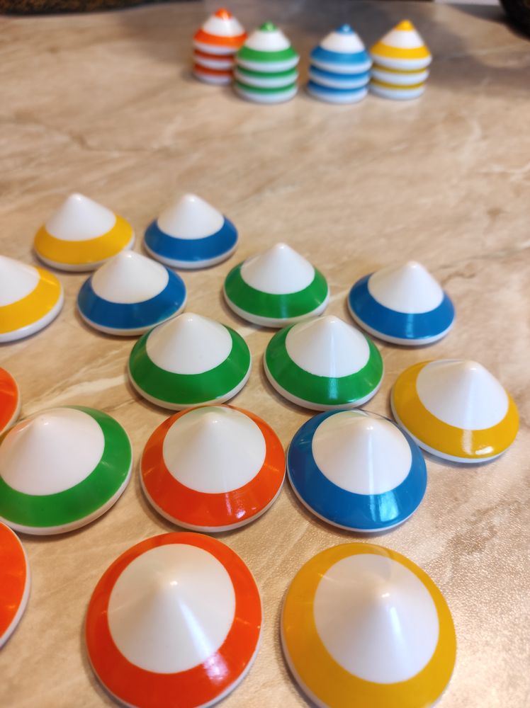 Затем на стол выкладываются конусообразные фишки-основания по количеству в зависимости от числа игроков.