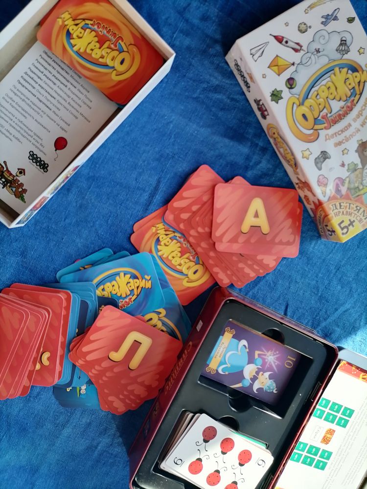 ЕщеЕще распаковали Сообрадажарий Дж и сыграли всей семьёй пару партий. Первый раз дочке было сложно, несмотря на то, что взрослые давали фору ей. А потом втянулась, стала соображать живее и во второй раз выиграла даже почти без поддавков. Хочу теперь игру Тематик купить, но уже для взрослых. Мы любим такие игры, особенно в дороге. Теперь будет с оформлением, а не просто на словах.