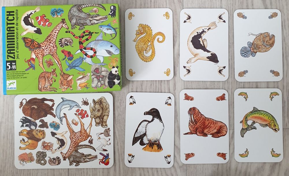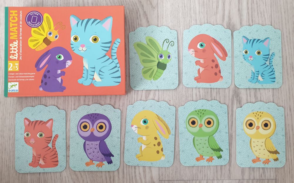Little family - каждому раздается по 3 карты, а дальше открывается верхняя карта колоды и нужно составить пару со своей картой или картой противника. У кого в конце игры больше карт, тот и победил. Зверюшки все очаровашки!