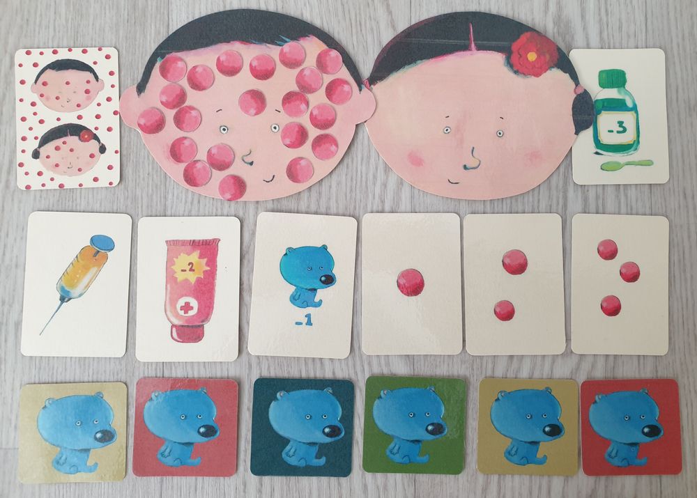 Стоп ветрянка! Эту игру мы заиграли как раз когда болели этой самой ветрянкой. Здесь открываем по очереди карточки из стопки и выполняем действия: добавляем кружок/кружки на личико, тем самым заражая человечка или лечим мазью или уколом. Жаль, что ее больше не издают, но зато она есть в открытом доступе вроде до сих пор в интеренете.