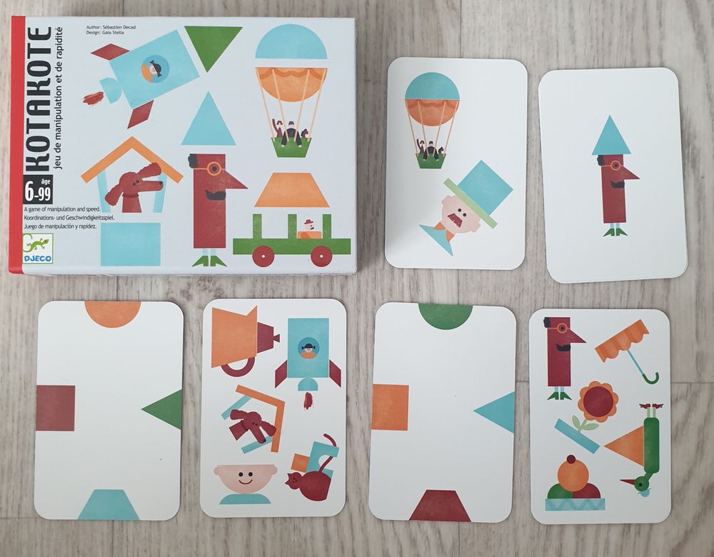 Kotakote- опять же игра на внимательность. Здесь требуется из своих карт, на которых нарисованы отдельные фигуры и части картинок, составить картинку с образца. Например из запчастей с двух левых карт из нижнего ряда можно составить коричневого человечка из верхнего ряда.
