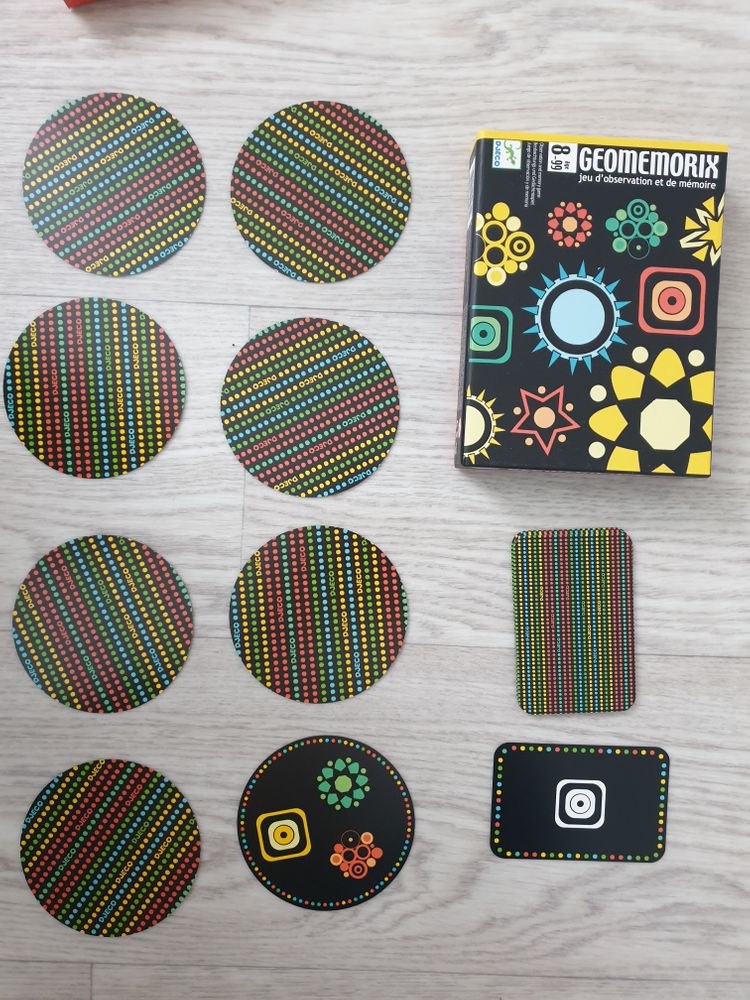 Geomemorix- игра на память, необходимо среди 8ми выложенных круглых карт, которые выложены взакрытую, найти фигуры с образца. Если фигура на искомой карте белая, то необходимо найти три таких же фигуры только разных цветов. Сделать мне показалось это крайне сложно, я лично действую в этой игре наугад, ну и чаще проигрываю))) возможно, здесь нужна тренировка!