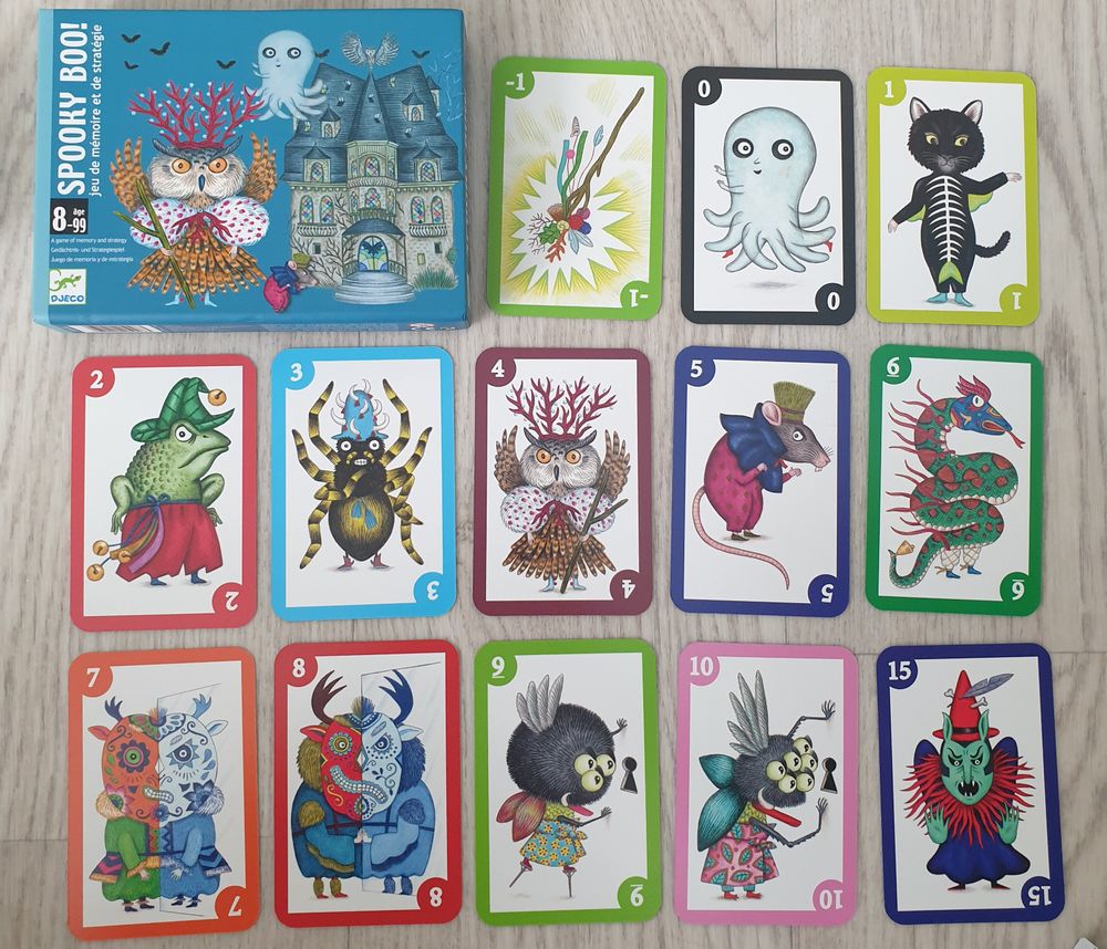 Spooky boo! - это аналог Карманного сафари. Необходимо, чтоб на 4х картах игрока (в Карманном сафари на 6 картах) была сумма равная 5. А вот картинки забавные, будем на Хеллоуин в нее играть!
